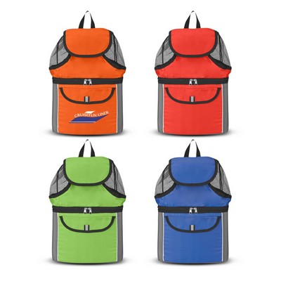 Backpack cooler bag which is manufactured from 210 polyester. It has a double zippered lower compartment with PE foam insulation encased in a waterproof PEVA inner liner which will hold up to six beverage cans. Other features include a drawstring mesh upper compartment, a hook and loop main bag closure, a front pocket with a hook and loop closure, adjustable padded shoulder straps and a carry handle. A production lead time of 10-15 working days applies to this product. Colours: Orange, Red, Lime Green, Royal Blue. Dimensions: W 305mm x H 430mm x 125mm. Branding Options: Screen Print-152mm x 89mm. Packing: Bulk. Carton Dimensions: 64cm x 43cm x 33cm x Carton Quantity: 40 pieces Carton Weight: 11.30kg. Price includes : Transfer/Printing 1 Colour. Setup is included.