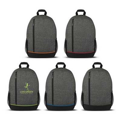 Backpack which is manufactured from polycanvas that is woven with different coloured fibres to create a very fashionable 'heather style' two tone fabric. It has a padded double zippered main compartment, a large front vertical zippered pocket, two external mesh side pockets, adjustable shoulder straps and a woven nylon carry handle. A production lead time of 10-15 working days applies to this product. Colours: Orange, Red, Lime Green, Blue, Black. Dimensions: W 280mm x H 405mm x 140mm. Branding Options: Screen Print-127mm x 203mm. Packing: Bulk. Carton Dimensions: 64cm x 43cm x 33cm x Carton Quantity: 25 pieces Carton Weight: 8.60kg. Price includes : Transfer/Printing 1 Colour. Setup is included.