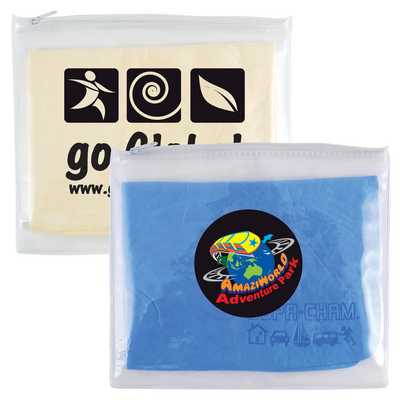 Synthetic pre wet chamois with rounded corners, cello bagged in clear PVC pouch. Chamois supplied with "Supa Cham" debossed logo as standard. Store Supa Cham in pouch when moist damp to ensure longevity and reusable application on cars, boats, vans and bodies. Collection: Home & Auto Category: Auto Accessories Colours Available: ClearBlue, ClearYellow Materials: Chamois: Synthetic, Pouch: PVC Item Size: Chamois: 425 x 315mm (LxH), Pouch: 245 x 210mm (LxH). Price includes : 1 Pos 4CP Standard Label. Setup is included.