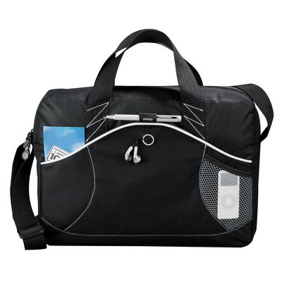 Description: Brief Bag with zippered main compartment and front pocket with velcro closure. Features: Includes front pen loop and mesh water bottle pocket, Front earbud port with easy access, Adjustable shoulder strap and 2 carry handles, Pen, mobile phone, iPod and business card holder on the back. Packaging: Polybag. Colour: Black. Material: 600D Polycanvas and Diamond Non-Woven. Product Size : 330mm(h) x 381mm(w) x 89mm(d). Decoration: Embroider, Screen. Decoration Area : Screen: 153mm(h) x 102mm(w), Embroidery: 63. 5mm(w) x 25mm(h), Transfer: 127mm(h) x 102mm(w). Earphones not included.