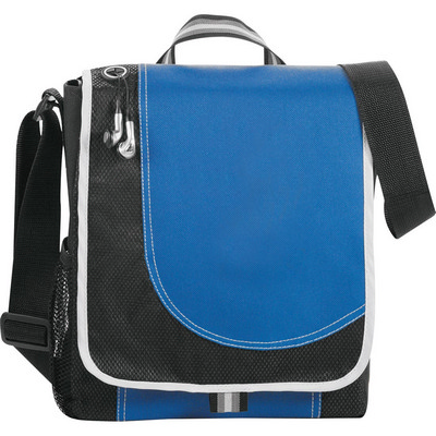Description: Messenger bag with open main compartment. Features: Media pocket under flap with access to earbud port, side mesh pocket and pen loop, Contrast pen loop and carry handle and adjustable shoulder strap, Available in 2 colours. Packaging: Polybag. Colour: Blue and Black with White Trim. Material: 600D Polyester. Product Size : 280mm(h) x 240mm(w) x 80mm(d). Decoration: Screen Print. Decoration Area: Screen: 120mm(w) x 100mm(h).