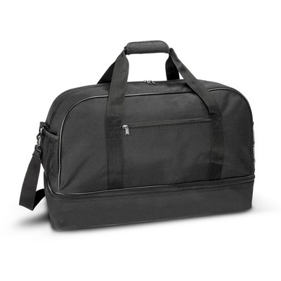 Large robust duffle bag which is manufactured from 600D polyester and has a handy lower compartment for shoes, sports gear etc. It has an adjustable and removable woven shoulder strap with a shoulder pad and woven carry handles with a Velcro cuff. Other features include a zippered side pocket and two mesh end pockets. Colours: Black. Dimensions: H 360mm x L 550mm x Gusset 250mm (excludes handles and shoulder strap). Branding Options: Screen Print-160mm x 90mm. Packing: Loose packed. Carton Dimensions: 64cm x 38cm x 42cm x Carton Quantity: 25 pieces Carton Weight: 14.50kg. Price includes : Printing Per Col/Pos. Setup is included.