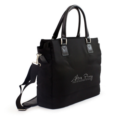 Stylish black ladies laptop bag, 1200D material with matt silver fittings, with leather look trims. Internal zip pocket and outer zipped pocket. Colours: Black. Product Size: 400 x 360 x 130mm. Material: 1200D Nylon, Leather Look Trim. Print Size: 200 x 100mm. Print Type: Screen, Transfer, Embroider.