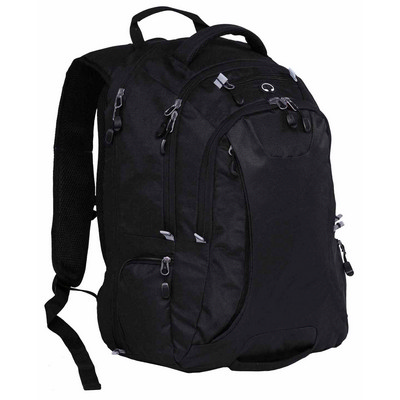600D polyester with PU backing and 1680D polyester. Two main zippered universal storage compartments. Fully cell foam padded lay flat laptop compartment with Velcro closure with additional tricot lined iPadtablet pocket. Front zippered compartment with multiple pocket organiser. Hidden front zippered security pocket . Top zippered drop in padded tricot lined MP3 pocket with rubber headphone exit port. Foam padded top and base grab handles. Two zippered side accessory pockets. Zippered passportsecurity pocket on back panel. Yoke padded shoulder straps with adjustable sternum strap with quick release buckle and padded mesh back panels. Rubber feet for added protection. Capacity: 36 Litres. Dimension: 33cm W x 48cm H x 23cm D. Decoration Area: Front: 80mm W x 150mm H. Colours: blackblack, navyblack.