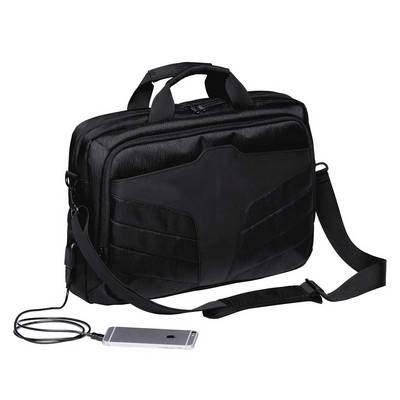 Jacquard polyester and water resistant 900D coated polyester. External USB charger port with integrated internal cable to charge your device. Three main zippered fully cell foam padded universal storage compartments including dual 15. 6 laptop and 10. 1 tablet compartments. Multiple organiser pockets. Padded grab handles. Detachableadjustable padded shoulder strap with metal buckles and accessories. Back webbing panel can slip over wheeled bag handle. Capacity: 14 Litres. Dimensions: 42cm W x 11cm H x 12cm D. Decoration Area: Front: 80mm W x 50mm H Transferprint only. Colour: black.