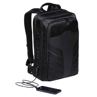 Jacquard polyester and water resistant 900D coated polyester. External USB charger port with integrated internal cable to charge your device. Four main zippered fully cell foam padded universal storage compartments with 15. 6 laptop compartment. Zippered passportsecurity pocket on lumber back panel. Foam padded top grab handle. Mesh backed padded shoulder straps and contoured padded mesh back panels. Hands free mobilemedia suction cup panel on shoulder strap. Back webbing panel can slip over wheeled bag handle. Capacity: 17. 5 Litres. Dimensions: 28cm W x 45cm H x 14cm D. Decoration Area: Front: 80mm W x 80mm H Transferprint only. Colour: Black.