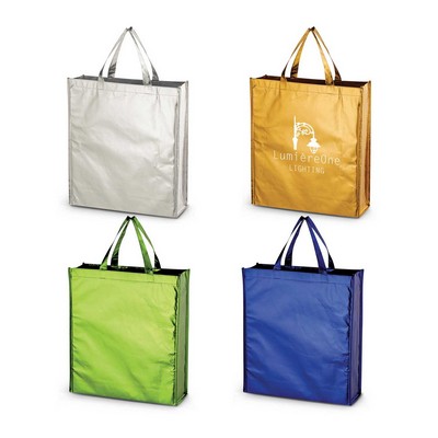 Eye catching metallic tote bag which is manufactured from laminated 80gsm non woven material. A production lead time of 10-15 working days applies to this product. Colours: Metallic Silver, Metallic Gold, Metallic Green, Metallic Blue. Dimensions: W 352mm x H 406mm x 108mm. Branding Options: Screen Print-254mm x 254mm. Packing: Bulk. Carton Dimensions: 64cm x 43cm x 33cm x Carton Quantity: 100 pieces Carton Weight: 12.20kg. Price includes : Transfer/Printing 1 Colour. Setup is included.