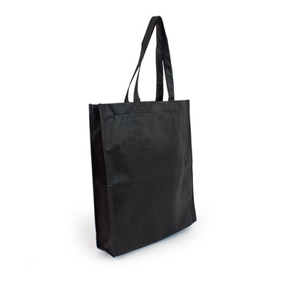Made from recycled material, 80 gsm with reinforced straps and gusset. Colours: Black. Product Size: 380 x 430 x 100mm. Material: Non Woven. Print Size: 200 x 200mm. Print Type: Screen, Transfer.