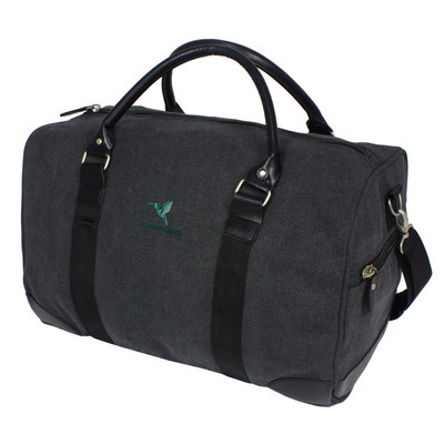 Stylish canvas overnight bag. Charcoal, with black contrast leather trim and webbing. Luggage tag on the right end panel, left end panel with zipper pocket. All fittings metal brushed silver, black internal lining, black zip puller. Colours: Charcoal. Product Size: 280 x 460 x 280mm. Material: Canvas. Print Size: 130 x 160mm. Print Type: Screen, Transfer, Embroider.