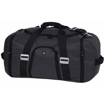 210D Tech performance two tone nylon with latex rubber backing. Ballistic Blue contrast 210D polyester lining. Huge main compartment with oversized zips and extra wide top to base U-shaped opening includes mesh accessory zip pocket. High grade aluminium hardware and accessories. Two gusseted end zippered pockets with neoprene reinforced quick grab handles. Back zippered compartment. Zippered side compartment with drop in tricot lined MP3 pocket with rubber headphone exit port. Oversized panel webbing for extra strength and durability. Neoprene Velcro wrap carry handle. Detachableadjustable padded shoulder strap with aluminium buckles. Dome feet for added protection. Capacity: 56 Litres. Dimensions: 63cm W 31cm H 29cm D. Decoration Area: Top: 250mm W x 150mm H, Ends: 90mm W x 80mm H. Colour: charcoal