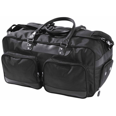 1680D ballistic polyester with leatherette trim and classic style handles. Oversized zippered main storage compartment. Ventilated shoe or wet gear end compartment. Dual front zippered storage pockets. Metal hardware and accessories. Adjustable padded shoulder strap. Button feet for added protection. Capacity: 52 Litres. Dimensions: 58cm W x 30cm H x 30cm D. Decoration Area: Front: 150mm W x 80mm H. Colour: black