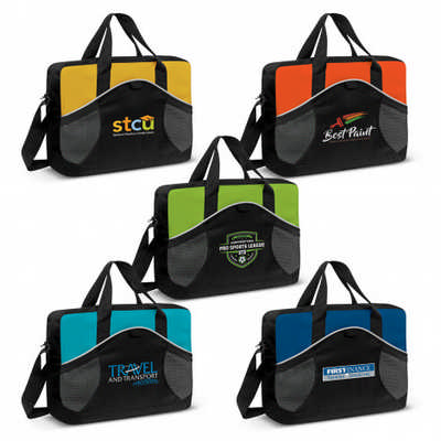 Stylish business satchel which is manufactured from robust 600D polyester. It has woven carry handles and an adjustable woven shoulder strap. Other features include contoured white piping, decorative mesh on the front, a handy slip pocket, a mesh side pocket and a business card holder on the back. Colours: Yellow, Orange, Red, Bright Green, Light Blue, Royal Blue, Black. Dimensions: H 285mm x W 400mm x Gusset 85mm (excludes handles and shoulder strap). Branding Options: Screen Print-140mm x 110mm. Packing: Loose packed. Carton Dimensions: 48cm x 32cm x 30cm x Carton Quantity: 50 pieces Carton Weight: 13.20kg. Price includes : Printing Per Colour. Setup is included.