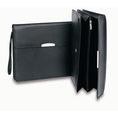 Milano leather look material, flap closure with silver trim, inside zip pocket, inside card and pen loops, removable wrist carry strap, available in leather