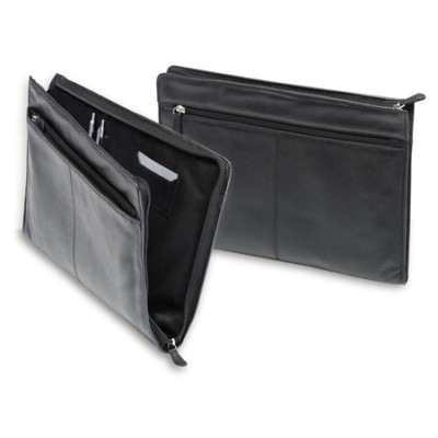 Top grain leather, inside and outside zip pockets, inside card and pen loops, removable wrist carry strap, available in leather look (made to order)