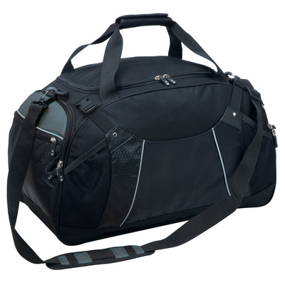 Give your team jump start with the featured inclusionsand striking panels of the Jump Sports Bag. Product Features: 600D420D polyester | Hexagonal ripstop feature panels, piping mesh panel on front | Front panel secured by two side release clips | Double zip end pockets feature zip valuables pockets | Double zip U-shaped opening | Business card holder | Carry handles with velcro cuff | Removable, adjustable shoulder strap with pad | Studded feet on base | Baseboard | Capacity: 50L. Product Item Size: 56cm x 32cm x 28cm d. Colours: Black, Charcoal. Decorations Options Available: Embroidery | Screen Print | Plastisol Transfer | Digital Transfer. Decoration Areas: Embroidery Area, Front Pocket: 9.5mm diameter, Lid: 95mm diameter, End Pocket: 125mm diameter | Print Transfer Area, Front Pocket: 270mm x 80mm h, Lid: 155mm x 70mm h.