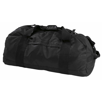 Reinforced ripstop nylon and 600D polyester with latex rubber backing. Huge end to end zippered main compartment with high grade zipper and covered storm flap. Dual top compression straps. Oversized panel webbing for extra strength and durability. Zippered side accessory pocket. Reinforced end quick grab handles. Detachableadjustable padded shoulder straps. Reusable stuff pouch for bag storage as well as internal packing accessory. Heavy duty oversized zippers and accessories. Capacity: 102 Litres. Bag dimensions: 80cm W x 32cm H x 40cm D. Stuff pouch dimensions: 18cm W x 36cm H x 8cm D. Decoration Area: Top: 250mm W x 150mm H, Ends: 90mm W x 80mm H. Colour: black.