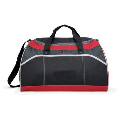 Navigate your way through any activity with this great looking duffle. Featuring honeycomb contrast panels. Product Features: 600D polyester with contrast honeycomb accent | Adjustable shoulder strap | 3 front pockets | Back panel is black | Top grab handles | Large main compartment. Product Item Size: 46cm x 28cm x 25cm d. Colours: Black, Black | Black, Royal. Decorations Options Available: Embroidery | Screen Print | Plastisol Transfer | Digital Transfer. Decoration Areas: Embroidery Area, Lid: 125mm diameter, Ends: 160mm diameter, Front Pocket: 125mm diameter | Print Transfer Area, Lid: 210mm x 110mm h, Ends: 110mm x 190mm h.