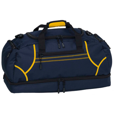 600D polyester with latex rubber backing. Huge main compartment with U-shaped zippered opening. Quick stash zippered front pocket with contrast twin cover stitch detailing. Two zippered end compartments. Drop bottom zippered compartment. Detachableadjustable padded shoulder strap. Velcro wrap carry handle for comfortable grip. Heavy duty zippers and accessories. Rubber feet for added protection. Capacity: 55 Litres. Dimensions: 63cm W x 29cm H x 30cm D. Decoration Area: Front: 300mm W x 90mm H, Top: 250mm W x 160mm H. Colours: navywhite, navyred, navygold, navysky, blackroyal, blackwhite, blackgold, blackred, blackcharcoal