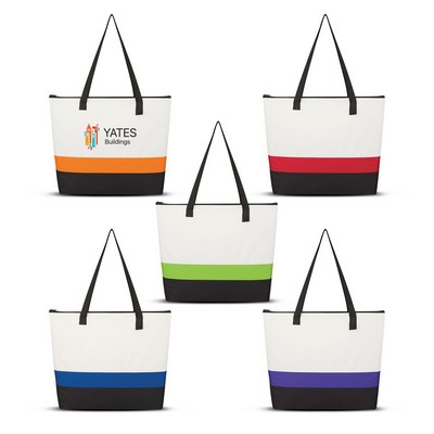 Tastefully striped tote bag with a secure zippered top closure, a handy pen holder and long woven carry handles so it can be carried on a shoulder. A production lead time of 10-15 working days applies to this product. Colours: Orange, Red, Lime Green, Blue, Purple. Dimensions: W 438mm x H 355mm x 76mm. Branding Options: Screen Print-305mm x 102mm. Packing: Bulk. Carton Dimensions: 64cm x 43cm x 33cm x Carton Quantity: 50 pieces Carton Weight: 11.30kg. Price includes : Transfer/Printing 1 Colour. Setup is included.