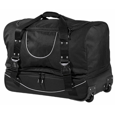 600D polyester with latex rubber backing and reinforced ripstop nylon. Huge main compartment with oversized zips and extra wide U-shaped opening. Solid built base locker compartment with reflective piping. In-line skate style wheels with corner protectors. Reinforced base fabric and plastic sliders. Recessed extendable telescopic handle. Oversized quick release side compression straps. Extra wide webbing and expedition grade hardware and metal zippers. Velcro wrap carry handle. Capacity: 98 Litres. Dimensions: 61cm W x 46cm H x 35cm D. Decoration Area: Front: 120mm W x 80mm H, Top: 300mm W x 150mm H. Colour: black