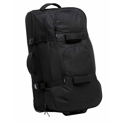 600D heavy duty polyester with latex rubber backing. Two compartments included inside main compartment, bottom compartment with solid built base, top compartment with mesh trim . Two zippered front pockets. Recessed extendable telescopic handle. Oversized quick release side compression straps. Four mesh backed quick grab handles. In-line skate style wheels with corner protectors. Reinforced plastic sliders on base. ID card window pocket on bottom. Capacity: 84 Litres. Dimensions: 29cm W x 76cm H x 41cm D. Decoration Area: Centre pocket 120mm W x 100mm H, Top: pocket 120mm W x 80mm H. Colour: black