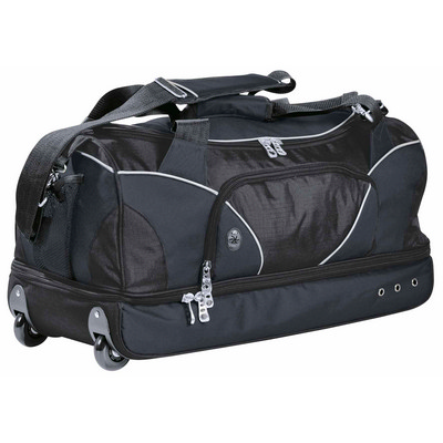 600D polyester with latex rubber backing and reinforced ripstop nylon with PVC backing. Huge main compartment with U-shaped zippered opening. Zippered side accessory pocket with rubber headphone exit port. Reflective piping. In-line skate style wheels with corner protectors. Reinforced large webbing carry handles with padded Velcro closure. Heavy duty oversized zippers and accessories. Detachableadjustable padded shoulder strap with metal fixtures. Mesh drink bottle pocket. Drop bottom compartment with baseboard and ventilation eyelets. Zippered end pocket. Padded end quick grab handle. Capacity: 62 Litres. Dimensions: 65cm W x 31cm H x 31cm D. Decoration Area: Front: 100mm W x 100mm H, Top: 300mm W x 120mm H. Colour: blackcharcoal.
